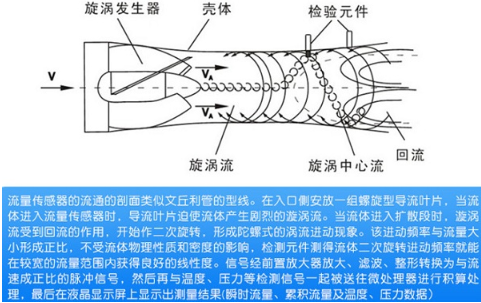 流量傳感器的流通剖面類似文丘里管的型線,在入口側安放一組螺旋型導流葉片,當流體進入流量傳感器時,導流葉片迫使流體產生劇烈的旋渦流。當流體進入擴散段時,旋渦流受到回流的作用,開始作二次旋轉,形成陀螺式的渦流進動現象該進動頻率與流量大小成正比,不受流體物理性質和密度的影響,檢測元件測得流體二次旋轉進動頻率就能在較寬的流量范圍內獲得良好的線性度。信號經前置放大器放大、濾波、整形轉換為與流速成正比的脈沖信號,然后再 與溫度、壓力等檢測信號一起被送往微處理器進行積算處理,在液晶顯示屏上顯示出測量結果(瞬時流量、累積流量及溫度、壓力數據)。